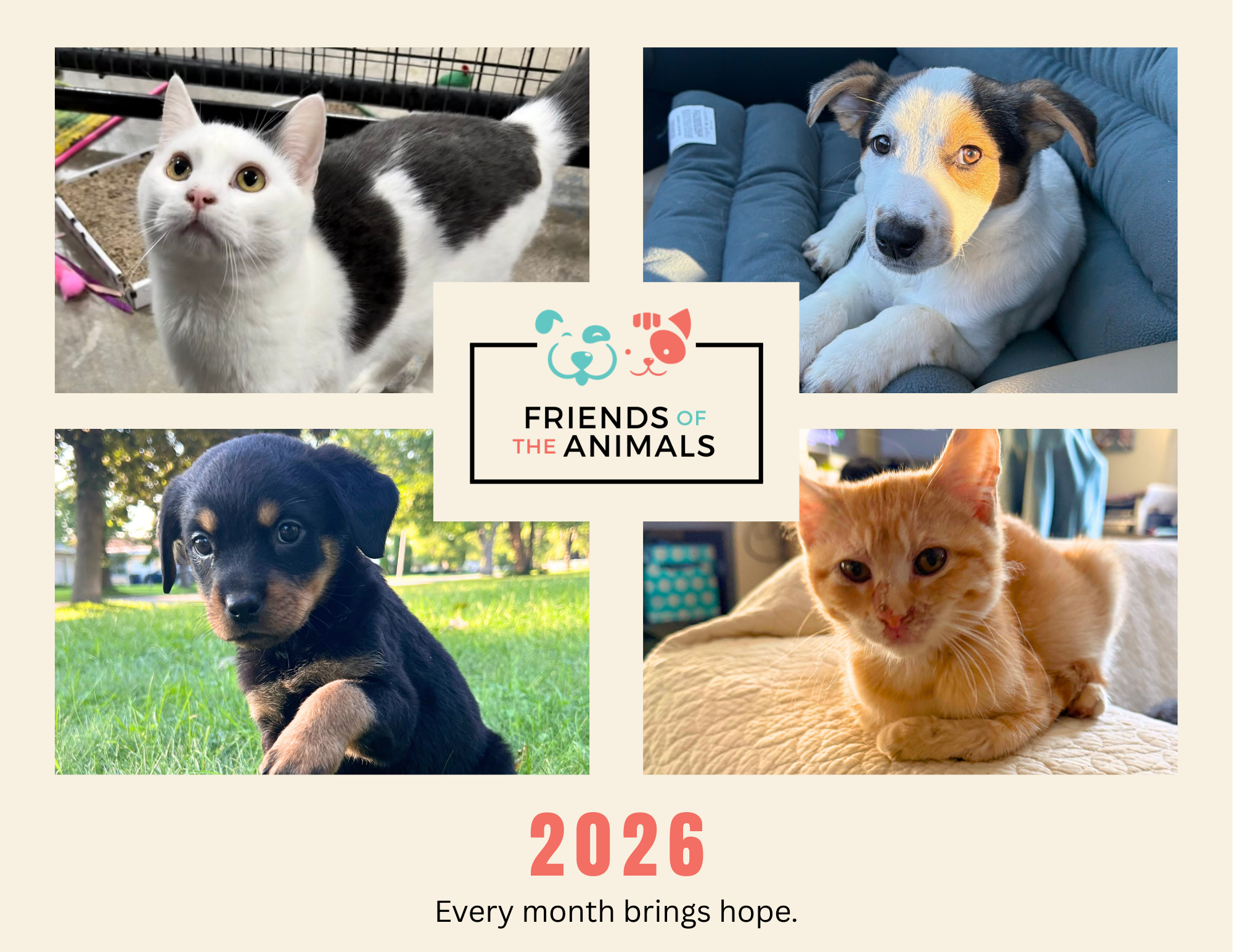 Full-color wall calendar featuring dogs and cats helped by our shelter.